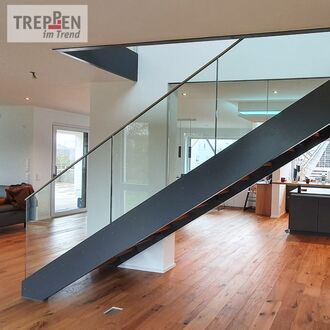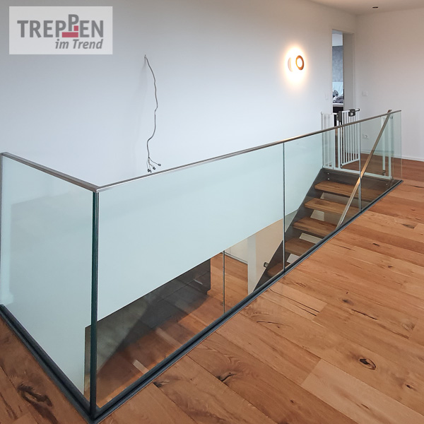 Ganzglasgeländer gehalten mit Klemmprofile in der Kastenwange dadurch rahmenlos, VA Abdeckprofil in Edelstahl.