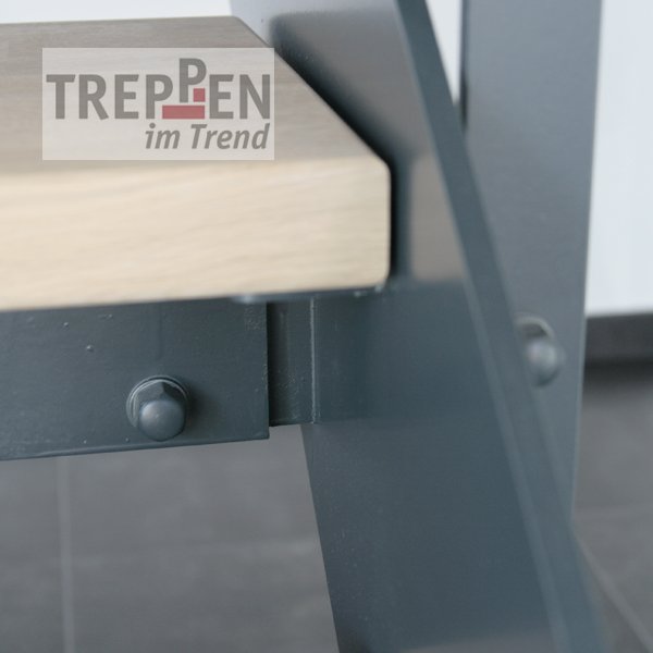 Flachstahlwangen mit Aufnahme für Holzstufen, Stahl anthrazitfarbig lackiert, Stufenmaterial Wildeiche parkett, Oberfläche weiß geölt