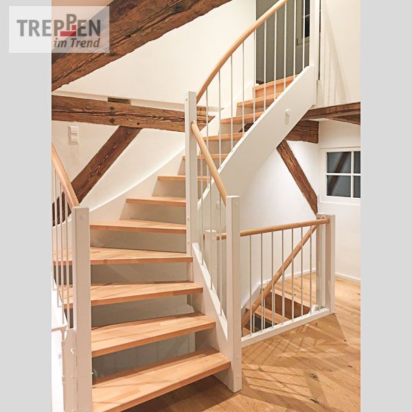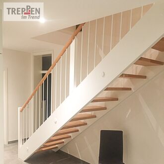 Die Treppenwangen, Geländerpfosten und Geländerstäbe sind deckend weiß lackiert.