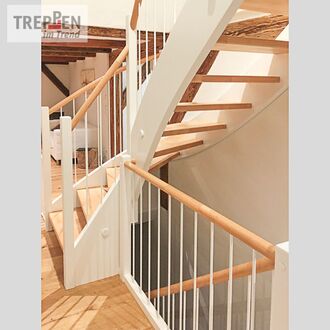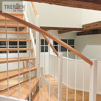 Massiver Rundholzhandlauf in Buche mit senkrechten Geländerstäben (kindersicher) in Farbe weiß.