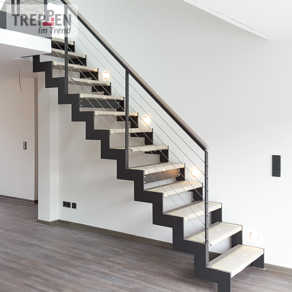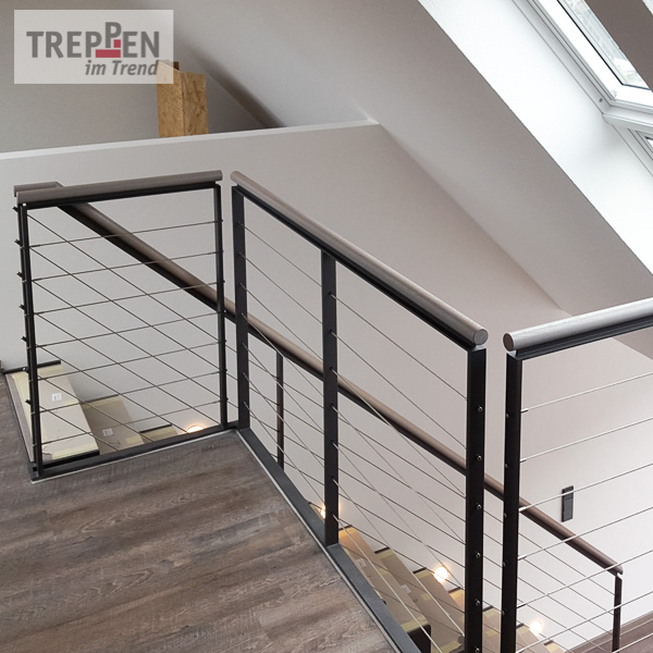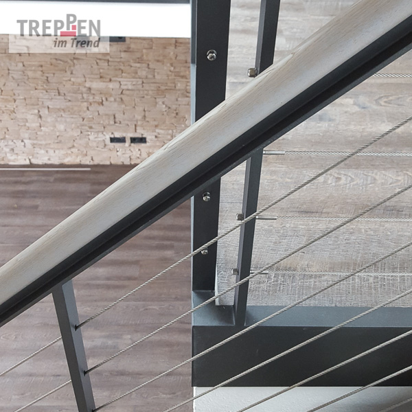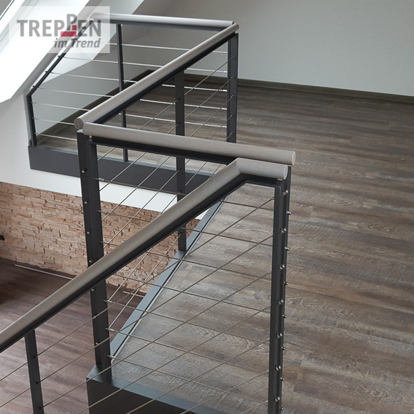 Geländer steigend Typ 950 als Reling Geländer (nicht kindersicher) mit Flachstahlpfosten FL 40 x15 mm lackiert, 7 horizontale Edelstahlseile d= 4 mm laufen durch gefräste Säulen, ein T-Profil 40x40x5 mm zur Aufnahme eines Handlaufs, Handlauf aus Rundholz Buche 40 mm Massiv ähnlich Schieferline gebeizt / lackiert