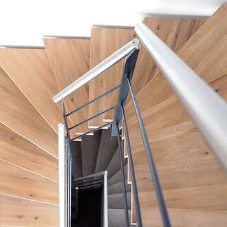 Stufen in Wildeiche Parkett Massivholz. Oberfläche weißlich geölt.